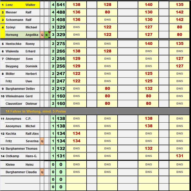 Der Punktbeste ist HRC-DEUTSCHLAND-CHAMPION und erhält den Sieger-Kranz. 30% d. Fahrer i.W. HRC-Trophäe NEWCOMER