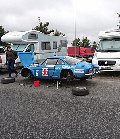 Beim Abfahren waren die Strecken schon recht feucht und nachmittags soll es auch bisschen regnen. Da Bastian schon kleine Probleme mit den Semislicks hatte, entschieden wir uns die Reifen zu wechseln und haben die Straßenräder montiert. Bis zum Start war noch knapp eine Stunde Zeit, also haben wir die Füße hochgelegt um etwas Schlaf nachzuholen. An Schlafen war aber nicht zu denken, denn an der Straße wo wir gestanden haben, fuhren bereits die Bestzeitler mit riesen Krach an uns vorbei. Kurz vor 2 Uhr, noch was zu essen eingepackt, ging´s dann los, Wir hatte bereits 3 Bordkarten erhalten, so dachten wir, 3x Pause oder Regrouping, aber nichts da. Durchfahren bis zum Dunkelwerden. Zum Glück hatten wir was zu essen mit. Die WP´s waren super, für die Alpine wie gemacht, selbst der Steinbruch ohne viele Schlaglöcher, allerdings sah das Auto aus.... Nach der 3. oder 4. WP stand Timo mit geöfnetten Haube an seinem Lancia Integrale am Rand. Kurz nachgefragt, Kupplungsseil gerissen. Schade für ihn und das schöne Auto. Davor habe ich auch immer Angst, wenn ich bedenke mit welcher Kraft wir die Kupplung treten |
