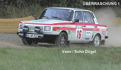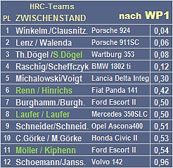 Umso verblüffender die Lichtschranken-Ergebnisse unserer Helden. Lenz erwartet man vorne, aber Winkel-mann schon weniger -- und die Dögels gleich gar nicht. Sebastian fährt seine allererste Rallye! Aber -- wenn man Schoemann /Janssen mal rausnimmt (Premiere) -- liegen alle Teams innerhalb einer 1/2 Sekunde. Speziell für die Newcomer sehr beachtlich! |