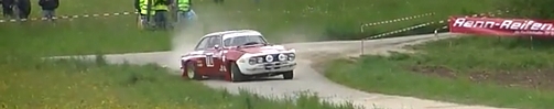 "Der Schweizer hat seinen Alfa böse rausgehauen..." Und ??? - "Die Karre ist krumm...." Rainer Schlesinger verbreitete diese Halb-Falschmeldung bei Zielankunft. Richtig ist, dass Fredy Suter die gute Gelegenheit zu botanischen Aktivitäten bei seiner HRC-Premiere entschlossen wahr nahm. Er arbeitete gut 50qm Wiese in WP7 nach alle Regeln der Kunst zu Ackerland um... Wobei das Furchen-Bild eher amateurhaft wirkte. Richtig ist aber auch, dass der eingesetzte Alfa 2000 GTV -Traktor kurz darauf völlig unbeschädigt ins Ziel kam! Wie das mit Kai Imhoff - dem armen Co dieses brachialen Rittes - aussieht bleibt hingegen unklar. Für ihn war es die erste Rallye überhaupt... |