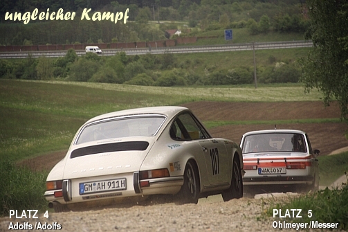 Und damit kommt es zum unglücklichen Aufeinandertreffen zweier (Staats-) Symbole mit völlig verschiedenen Voraussetzungen. Der DDR-Rallye-Wartburg kommt auf ein Leistungsgewicht ca. 13 kg/PS. Der BRD-Porsche (gefühlt) auf die Hälfte 6,5 kg/PS. "100 PS Differenz ist zu viel..." meckert Sven im Wartburg. |