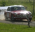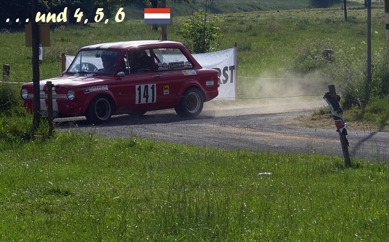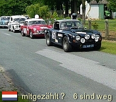 Eigentlich ist es nun genug der Ausfälle ??? Na ja... Der herbe Verbremser in WP4 bleibt für Michels /Beltman ohne Folgen. Cornelissen /v.d.Broek haben den Ersatz- Triumph 250 klar bekommen und sind zügig dabei... Smits /Smits fahren problemlos mit dem schönen, authentischen MG B... Die Rallye ist geprägt von zahlreichen Ausritten (Bestzeit), welche gottlob nur den Wagen weh tun. Aber es kommt naturgemäß zu Verzögerungen. |