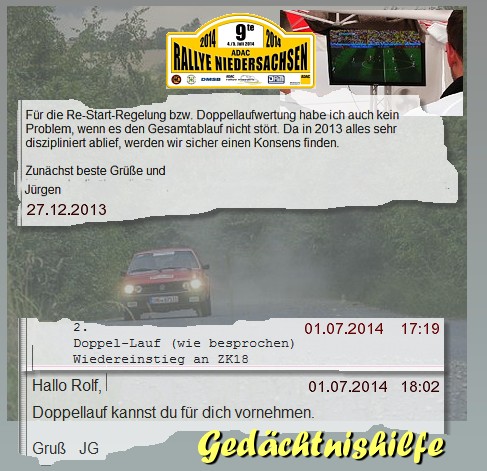 Folglich war er sehr kompromißbereit und stimmte unserer Bedingung "Doppel-Lauf" sofort zu. (27.12.13) "Doppel-Lauf" bedeutet dass Teilnehmer, die im ersten Lauf ausgefallen sind, nach Reparatur an einem Punkt X wieder einsteigen können (für die HRC-interne Wertung). In der Woche vor der Rallye - als der Zeitplan bekannt wurde - konnte ich diesen Punkt X mit ZK18 benennen - und J.Glaubitz am 01.07. mitteilen. Knapp 1 Std. später bestätigte er. |