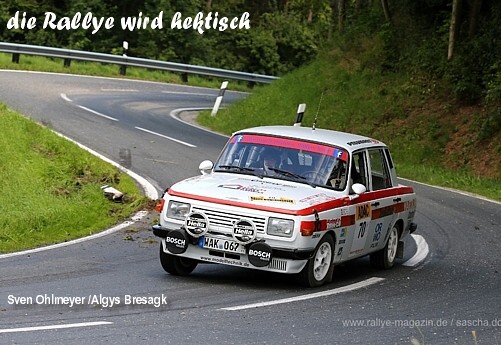 Bei den Bestzeitlern herrscht das große Auto-Sterben. Nur 31 Teams (von 52) erreichen letztlich das Ziel im Osterode. Die Rallye hat ein Problem. Seit den Unfällen am Morgen (Bestzeit) hetzen die Historischen Sollzeit Fahrer mit über 1 Std. Rückstand hinter dem Feld her. WP6 wird neutralisiert... Das bringt sie etwas näher ran. Die Regroupings werden zum Rein-Raus... Noch immer gibt es aber ein 3/4 Std-Loch. Das bleibt bis ins Ziel. Am Service wird improvisiert... Aber von uns fällt keiner mehr aus. Obwohl einige heftig schrauben...