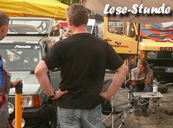 Mathias Mensinck hat die Spur vom Panda krumm gefahren. "Da war so ein tiefes Loch..." Und dann verlangt er einen Rangier- wagenheber und stellt die Spur nach! |