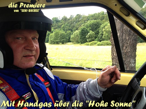 Bändsel lang genug? OK. Ein Ende am Drosselklappen-Hebel verknotet. Der Strick wird außen an der Karosse "geführt"... Schnell noch eine Schlaufe in das andere Ende gefochten - für die ordnungsgemäße Betätigung... Seitenfester auf, Bändsel durch... Alles gängig? - Anschnallen !! Wir sind wieder dabei. Unter dem Applaus der Fans röhrt der Skoda davon. Im Service liegt ein Ersatz-Seil. |
