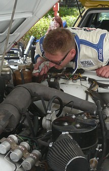 Sven war wie immer, wenn er den Fahreranzug überstreift... Die elegante Gelassenheit ist wie weg geblasen. Hektische rennt er hin und her... Kontrollblick... Tunnelblick... RALLYE Der Samstag brachte zunächst - den üblichen und prophylaktischen Kerzen- wechsel. Sicher ist sicher... |