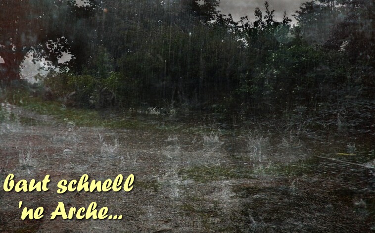 Die - am Vortag radikal korrigierte - Wettervorhersage (von "schön" auf "mies"), ließ schlimme Befürch- tungen wach werden. Als sich dann im Eingangsbereich unseres Zeltes langsam ein mitlerer See bildete, wuchs die Erkenntnis, dass wir wohl die falsche Stelle fürs Zelt gewählt hatten. Als Letzte trafen Christian und Marion Görke ein. Die mussten schon einen seeehr großen Schritt über den wachsenden Teich machen. - Mehrfach... Denn der Grill war längst evakuiert und unter das Vordach der Berufs- schule gerettet. |
