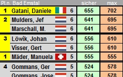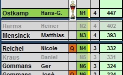 Der Favorit HG Ostkamp nun einsam vorne ??? Ja -aber... 2 x ausfallen darf er nicht ! Dann: 587 Pkte.. Matthias Mensinck erreicht mind. 593 Pkt. (kein Ausfall, 2x100). Heiner Harms u. Daniel Kraus starten nicht im Finale und sind raus. Ger u. José Gommans können noch Platz 4 erreichen, aber Manuel Schlotterbeck drängt nach vorne (Pl.3 ?). |