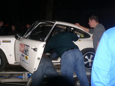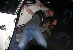 Johan "bellt" das Porsche-Zentrum Hengelo an... Um diese Uhrzeit? "Ja - das geht schon... Die fahren auch Rallye..." "Na dann..." "Die rufen zurück..." Aber als der Rückruf tatsächlich kommt - ist er negativ. Die haben alles an Hydraulik - aber kein Seil. Johan entscheidet. "Bindet den Porsche wieder fest. Wir fahren in meine Firma. Dort haben wir alles... und können auch bestens improvisieren..." |