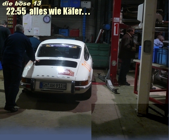 Egal. Jetzt ist Porsche-Zeit. Zeit ??? 22:55 Uhr Die Hebebühne erfährt eine Art Ritterschlag. Dort wo sonst immer nur britisches Gerödel auf und nieder macht wird jetzt Deutsche Qualität...? Na ja - das berühmte "Made in Germany" ist scheinbar auch nicht völlig unberührt von technischen Halbwertzeiten - wie man sieht. Die Görke-Truppe verabschiedet sich. Zu viele Köche - und morgen ist Rallye. Gute Nacht und vielen Dank. ------------------------------ Hoch mit dem Gerät und erstmal die Lage peilen. "Das ist ja alles wie beim Käfer!! Nur der Ausrückhebel vom Getriebe sitzt etwas anders." Kein Seil-Rest zu sehen... "Ihr müsst erstmal die Gummi- Durchbiegung ausbauen." Das zerfledderte Ende des Seils ist freigelegt... Duchgescheuert! Nun in den Fußraum...