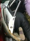 Johan geht auf die beschwer- liche Tauchstation zwischen die Porsche-Pedalerie. Gynäkologisches Gefummel, dann taucht er wieder auf... Mit dem Seil... Jetzt haben wir ein Muster. |