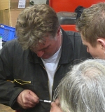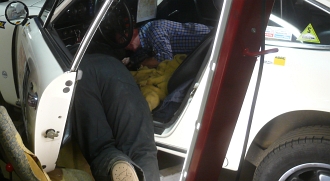 Johan "taucht" wieder in den Fußraum, Rainer assistiert und leuchtet... Das Seil muss jetzt von vorne in das verflixte Führungs-Röhrchen einge- fädelt werden. Frauenfinger müsste man haben... Johan hat eine Engelsgeduld - aber leider auch sehr kräftige, zupackende Männerpfoten... |