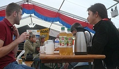 ![]() Samstag, 9:30 Uhr Ich stehe im Rallyezelt und bitte um zwei Brötchen und einem Pott Kaffee. "Noch 'n O-Saft, dann isses ein Rallye-Frühstück..." Ich folge dem Tipp der freundlichen Dame... Während des Studiums des Programm- heftes bevölkert sich der Nebentisch... Reflexartig nehme ich das blutjunge Mädel wahr. Verdammt hübsch - uralte Instinkte ohne realen Hintergrund... Dann taucht eine Dame der Organisation auf (eben noch Papierabnahme), begrüßt die Gruppe nebenan... wuselt wieder weg und kehrt kurz darauf mit Frühstück zurück. |