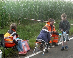 Samstag, 15:50 Uhr WP3, Landstraße Spielberg nach Streitberg, dort wo die Rallye mit einer L1 zwischen Mais und Strohballen auftaucht. In Spielberg ist die Straße gesperrt. Ich quetsche mich daran vorbei und lande glücklich am Flatterband. Dort hält eine junge Frau mit 3 Kindern Wache. Ein Funkgerät quäkt Startnummern. Das Mädchen notiert sie in eine Liste und hakt beim Passieren ab... Dann übernimmt der ältere Junge. Der Jüngste hat keinen Bock auf Rallye und wird leicht destruktiv... Ein Zuschauer will mitsamt Fahrrad auf die andere Seite und eine Autofahrerin möchte wissen, wie sie denn jetzt nach Streitberg kommt. Die Kinderchen nörgeln... |