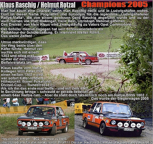![]() Keine Frage. Die 02er-Serie von BMW war der engültige Image-Rückgewinn der Marke nach den schwierigen Nachkriegs-jahren. Anfang der 70er Jahren bestimmten die BMW 1602 und 2002 das Bild des Deutschen Rallyesports mit einer Serie von Meisterschafts-Titeln (Bein, Zweibäumer) und dem gewonnenen Zweikampf mit dem Rallye-Kadett. ![]() Die Tuner Alpina (schwarz-orange) und Schnitzer (blau-weiß) waren für die Rallye-Einsätze zuständig. ![]() Das Werk selbst engagierte sich nur halbherzig. Mit Achim Warmbold und Tony Fall wurden zwar TOP-Fahrer unter Vertrag genommen, mangels Einsätzen aber an VW "ausgeliehen". Einziger BMW-WM-Sieg: 1972, Rallye Portugal, Warmbold. Gr.2-Version: ca. 190 PS bei 1.050 kg |