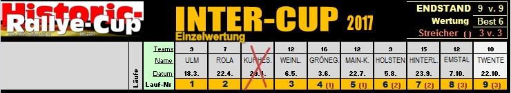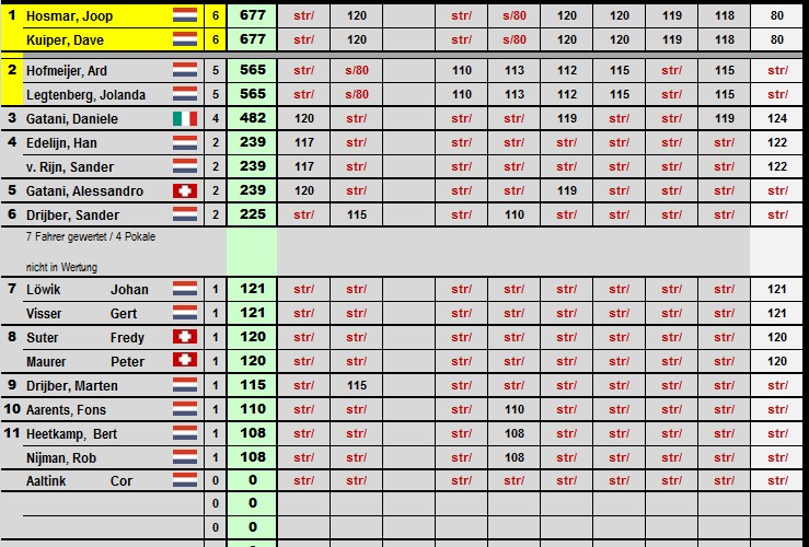 Glück gehabt! 3 Siege, 1mal Zweiter, 1mal Dritter... aber auch zwei Ausfälle. Wenn Hofmeijer im Finale gestartet wäre.... Seit erstmals 2006 Schweizer antraten, haben wir eine Sonderwertung für unsere ausländischen Freunde "erfunden". Aus dem SWISS-CUP wurde dann der ALPEN-CUP und seit 2010 der INTER-CUP (erste Niederländer). |