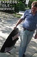 Himmel, Arsch und Zwirn ! (1) Als ich sein Hinterteil erblicke trifft mich fast der Schlag. Karlchen ist hinten völlig entblößt, nackt - schamlos offen !!!!!!! Heckklappe mitsamt Nummernschild weg -- verloren! - Aber wann, wo...? Die Schnellverschluss-Schweißung ist glatt gebrochen. Nur die Splint-Sicherung mit Fragment ist noch da... Grinst mich sinnlos an... Zeitnahme-Chef Peter Rother schlendert fröhlich vorbei, wird flugs zum Alarm-Not-Funkruf in Sachen Fahndurg gebeten. Knapp 10 Minuten später die erlösende Rückmeldung: "Haube gefunden, steht am Start WP2 bereit.." Dort ist doch Björn als Zuschauer...? Das Rallyeschicksal meint es gut mit uns. Björn reagiert sofort als wir pornografisch vorbei kommen... |