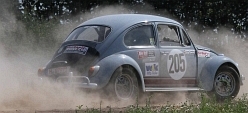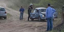 Handbremse, links durch die Schranke, Schwung mitnehmen für den nötigen Gegenschwung in Kehre rechts.... Das war der Plan... Mist - er ist schon wieder tot... !! Und diese Stelle ist übel... Karl rollt unmittelbar hinter der Kehre aus. Hoffentlich ist der Streckenposten wach! Foto-Kollegen hopsen um uns herum... (s.Titel) Wieder raus aus der Karre. Haube auf... Heiner lächelt gequält in die Kamera... Entwarnung! Das Zündkabel ist nur von der Kabelbinder-Wackel-Spule geschüttelt... Das ist ein einziger Handgriff...