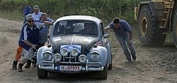...ist ab sofort Heiners Dauer-Kommando. Mir macht aber die innige Verbindung von Lima-Kabel und Zündspule mehr Sorgen. Vor der WP4 steht Jürgen Noll (Bestzeit), ist traurig, weil mit 2 Plattfüßen (Reifen !!) ausgefallen. Er wird dienstverpflichtet. Zusammen mit Heiner wird hinten besserer Halt für die Zündspule gesucht - während ich vorne Karlchen "am Leben halte..." Das Duo wählt das Gasgestänge (!!!) Aber die Drosselklappen funktionieren doch überraschend gut - trotz angekoppelter Zündspule. Wir freuen uns über sandigen Asphalt... |