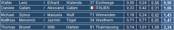 HALBZEITBILANZ Offensichtlich hat Walter Adleraugen. Die Titelerteidiger bewältigen die "versteckte" Lichtschranke WP1 mit einer ziemlich schockierenden 0,00 und gehen sofort in Führung. Die 0,66 in WP3 paßt dann aber so gar nicht ins Bild... Die Gatanis kommen bis auf 1/16 Sek heran. Dahinter tobt - mit schon deutlichem Abstand - der Zweikampf der PANDAS.