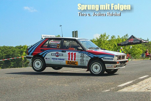 weiter Tino: Danach hatte unsere Lenkung einen Knacks. ... Lenkgetriebe oder vielleicht auch Traggelenk oder irgendwas anderes am Vorderwagen. Egal, ich bin da ja ein Hypochonder (meine Beifahrer kennen das). Zum Glück war nach der WP Regrouping, also Zeit für eine kurze Beratung. Am Ende stellten Daniele und ich gemeinsam fest, wenn das Lenkgetriebe doch eh kaputt sein sollte können wir auch bis zum Ausfall weiterfahren. Gesagt getan, etwas Gas rausgenom- men und immer einen Notausgang im Blick haben wir die restlichen WPs abgespult. Ein unschönes Gefühl aber es ging schon (waren am gelben Schild nur 10 Sec. langsamer als bei den ersten Durchläufen). Aber was auch gesagt werden soll: Die WP hatte mehr zu bieten. Zum Beispiel ging es nach besagter Kuppe 250m volle Lotte durch den Wald auf ein ca. 50m kurzes Schotterstück vor einer R1. Heißt aus ca. 140km/h das Auto auf dem Schotterstück einzufangen und in die richtige Richtung zu stellen damit's danach weiter geht. |