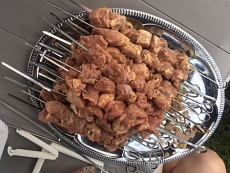 Christian Görke - diesmal mit Tochter Marion unterwegs - kramte eine beachtliche Menge russischer Fleischspieße aus seinem britischen Ford Transit, der den amerikanischen Studebaker Hawk über die Autobahn nach Melle gezerrt hatte... "Schönen Gruß von meiner Frau..." Die hat nämlich sibirische Wurzeln, heißt Evgenija und die Schaschlik sind ein Stück alte Heimat...