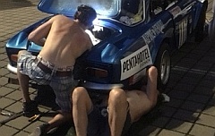 Die Skobisse (Alpine A110) wechseln schnell im Fahrerlager den Anlasser um peinliche Zuschauer- Schiebungen auf die Rampe (wie 2016) tunlichst zu vermeiden. |