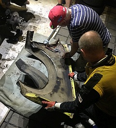 Tobi und Seb gehen mit Feuereifer ran ans Blech. Oliver darf den Kotflügel halten... Startnummer 119 steht am nächsten Morgen tatendurstig und bereit zu neuen Abenteuern im Fahrerlager. Einäugig zwar und mit Narben - aber das zeugt nur von den großartig bestandenen Heldentaten... |