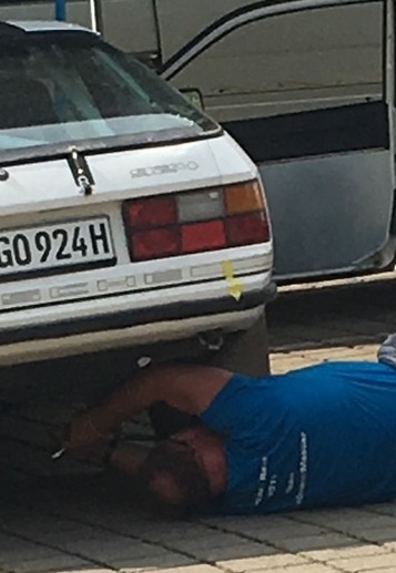 Gerd Winkelmann: Mit 35 Grad Außentemperatur war es dann doch noch etwas zu Frisch. Abhilfe gab es in dem wir einfach unsere Heizung voll aufgedreht haben. Fand der Motor irgendwie auch besser. Also Lüfter Motor vorne noch mal schnell repariert. Ein klackern hinten rechts verhieß nichts Gutes. Auch hier war das Ignorieren irgendwann einmal nicht mehr Hilfreich. Eine Bushalterstelle mußte als Werkstatt herhalten. Mit MC Gywer Art wurde durch herauszaubern eines Multifunktionswerkzeuges mal eben die Antriebswelle hinten rechts mehr schlecht als recht festgezogen. Dreimal bis zum nächsten Service. Hier konnten wir ein andres Retroteam erweichen uns das richtige Werkzeug zu leihen. Der Rallyegeist hat geholfen. In der Zwischenzeit hat Christian Assmann herausgefunden das es doch eine Karenzzeit gibt und somit blieben wir im Rennen. Sind aber nach hinten durchgespült worden. |