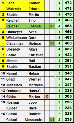 ![]() Lenz /Walenda auf Kurs Titelverteidigung. Die Führung ist aber viel knapper als gedacht. Martin Skobis 3 Pkte und Vater /Sohn Reichel 5 Pkte zurück.
