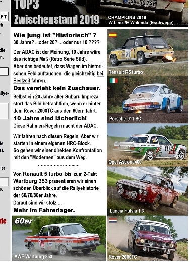 Aber muss der gerettet werden - und wieso durch die Retro-Rallye-Serie ? Im Jahr 2017 entstand durch das Verbot der Gr.H tatsächlich ein Einbruch bei den Bestzeitlern und viele Veranstalter gerie-ten in wirtschaftliche Schwierigkeiten. Aber schon 2019 war fast alles wieder wie vorher. Einige Ausnahmen wurden durch die Historischen "gerettet" (z.B. Calw: 40 Best / 40 Retros). Wieso der ADAC Pfalz gerade in 2019 seinen Test "unter 20" initiierte bleibt sein Geheimnis - ebenso der Ausgang. Die Ergebnislisten geben keinen exaxten Aufschluß - aber es taucht kein Fahrzg.-Modell auf, dass zwingend in diese Kate-gorie einzuordnen wäre. Ein Test ohne Ergebnis ?? Egal - der ADAC Pfalz setzt 2020 sein Konzept rigoros bundesweit durch. Das schmerzt. Denn warnenden Stimmen gab es genug. Nicht zuletzt unser Text in den diversen Programmheften der Veranstalter KLICK - der ohne Ausnahme abgedruckt wurde - ist Beweis für deren Wunsch nach mög-lichst attraktiven Starterfeldern. BMW E46, Golf VI und ....? 10 Jahre alte Wagen als RETRO anzukündigen ist Etikettenschwindel. |