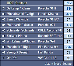 Einige Süd-Teams fehlen. Daniele Gatani (Porsche 911) fährt die legendäre "Costa Brava" und hat Detlev Burghammer als Co angeheuert. Fredy Suter (Alfa GTV) fährt auch in Spanien und wird danach an der Bandscheibe operiert. = 3 Süd-Teams auf Abwegen... Der zweite Blick in die Starterliste offenbart dann aber, dass 40% unserer Schönen aus dem Norden anreisen ! |
