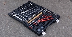 Haarscharf ging Gerd Winkelmann am "Ausfall d.Jahres" vorbei als er völlig über-raschend feststellte, dass sein Lenkrad weg wollte. Es ist mit einer Vielzahl kleiner Imbusse fixiert. Und sowas hat keiner im Bordwerkzeug... Oder? Gerd Michalowski öffnet lässig seinen Komplett-Kasten. Bitte! - Stratos-Spezial |