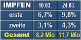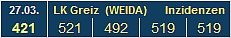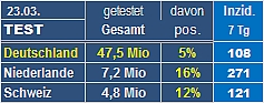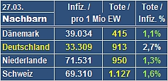 Ersatzlauf ? 27.03. Scheinbar hat das RKI am 26.3. einen Fehler (521) gemacht. Oder stimmen die Zahlen vom 27.03. nicht...? Wir schöpfen jedenfals wieder Hoffnung. Über 100 Rückgang in 1 Woche ! |