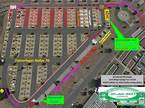Vom Fahrerlager - Parkplatz von einem großen Möbelmarkt - bis hin zu den Zeitplänen und "Rallye-Guide" war alles exakt eingetaktet. Lediglich bei den Sportwarten gab es im Vorfeld einen Engpaß, der zufrieden- |