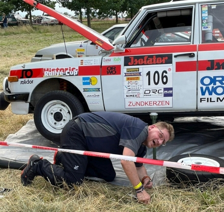 ![]() Cristina: "Das Abfahren lief reibungslos und wir haben uns total auf die Rallye gefreut. Die Strecken waren super ausgepfeilt. Zurück im Fahrerlager: Der Wagen von Frank hatte schlech-ten Leerlauf, Winkelmann ein Klacken und Sven stellt die Kupplung nach... " |