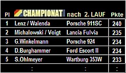 Nur diese 3 Teams haben die ersten 2 Läufe absolviert. Schneider (Ascona) startet nicht mehr. Vivien Szönyi (Pl.1) hätte beste Chancen, startet aber nicht. Jan Harmsen (Volvo) startet. |