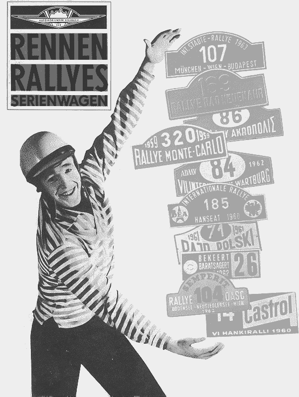 Werkseinsätze Seit 1956 fährt AWE ausge-wählte intern. Auslandsrallyes. Die Fahrer kommen fast alle aus Eisenach und sind gefeierte Idole in der Region. |