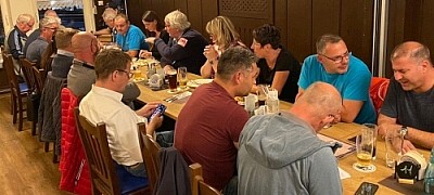 Eine entzückende Idee, die TA öffentlich am Markt zu machen. Leider hielt sich die Publikumsresonanz in Grenzen. Im "Augustiner Bräu" -- Sven's Sponsor -- traf sich anschließend die fast komplet-te HRC-Truppe bei Münchner Bier und Thüringer Spezialitäten (wahlweise). Daniele Gatani hatte neben dem Porsche auch Gustavo Farias für die weite Reise aus der Schweiz eingeladen, und Mental-Coach Frank Meinhardt ("...alles Kopf-sache") durfte erklären, wieso er nicht starten konnte. Krumme Porsche Ventile überzeugten... Günther Ostkamp (...mit Sohn Lukas) gerät zunehmend in Capri-Erklärungs-notstand weil er wieder mit dem Golf... |