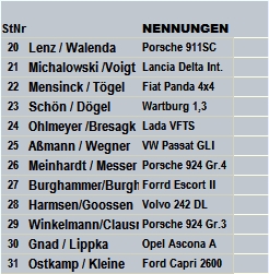 CORONA / FLUT / WAHL Die Pandemie geriet leicht in Verges-senheit, andere Themen schienen wichtiger... Nur 2 Teams mit 4 Läufen Mit d. Rallye Wartburg -- aufatmen des Vorstandes -- war unsere "Saison" gerettet (min. 4 Läufe). ![]() Michalowski /Voigt (Lancia Fulvia) hatten nach zwei Läufen 5 Punkte Rückstand auf Lenz /Walenda -- dann begann die Aufholjagd mit dem neu erworbenem Lancia Delta Integrale. Zuletzt hatte der Lancia zweimal die Nase vorn, aber Lenz war beide Male Zweiter und verlor so nur 2 Punkte von seinem Vorsprung. Damit war vor der Rallye Hessisches Bergland klar, dass Michalowski /Voigt ohne Schützenhilfe die 3 Punkte nicht mehr aufholen konnten... 2 Teams mussten zusätzlich zwi. Lancia und Porsche landen. |