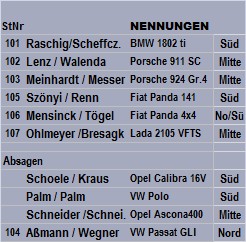 Meisterschafts-Favoriten Gerd Michalowski (Titelverteidiger) rührt sich nicht. Hans G. Ostkamp sagt ab. Frank Schneider bastelt noch am Motor des Ascona400, schickt aber seine Nennung raus... Hoffnung... dann Absage Als dann auch Ch.Aßmann /C.Wegner absagen müssen ist die Peinlichkeit komplett. |