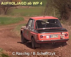 Die Kabelbinder-Reparatur war reine Notwehr und hielt ungefähr knapp 2000 Meter. Dann begann die vordere Halterung der Schutzplatte ebenfalls zu schwächeln... ALARM im PANDA Kai Renn: "Ich hatte Angst, dass sie ganz abreißt -- und sich unterm Wagen aufstellt..." Konzentration u. Platz 3 verloren (Raschig-BMW). In Winnenden feiern sie Platz 4 |