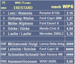 WP5 wird gestrichen. Im Ziel dürfte den Siegern der Schreck durchs Zuffenhausener Gerät gerauscht sein. 1,02 Sek in WP6... !!! Nur 0,1 Sek vor dem Ostkamp-Capri. Das war knapp. |