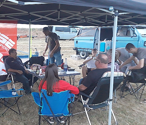 Im HRC-Camp angekommen, begrüßte man die "Konkurrenten", stellte fest, dass die Neuen den HRC-Platz wohl nicht gefunden hatten u. freute sich über über die Bekanntschaft von Gerd Winkelmann, der sich in den Honda Civic von Michael Görke quetschte -- als Aushilfe für Marion. Matthias Mensinck erzählte von der Begeisterung, die sein Allrad-Panda bei der TA ausgelöst hatte... Er vermutete "Versteckte Kamera". |