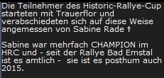 Rallye Oberberg (Raum Köln) Wir hatten große Hoffnung auf diese Rallye gesetzt. Denn im Westen sind Rallyes rar und wir suchen seit Jahren... Umso erfreuter sind wir über eine erstklassige Veranstaltung mit 24 HRC-Startern. Leider wird der gute Eindruck im Ziel relativiert, da unser Fahrer-Verbindungsmann Christian Aßmann von Rainer S. beschimpft und beleidigt wird. Dieser hatte hinter der ZK einen Reifen gewechselt. Daraufhin hatten mehrere Teilnehmer eine Bestrafung gefordert. Christian machte seinen Job und ging zur Rallyeleitung... Dort wurden ihm zu unrecht Eigennutz unterstellt und die Sache verworfen. |
